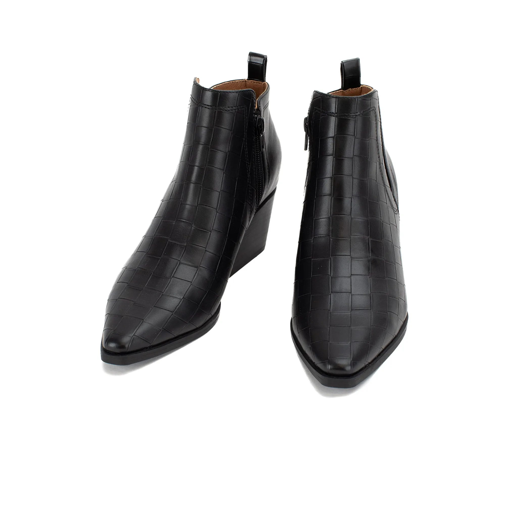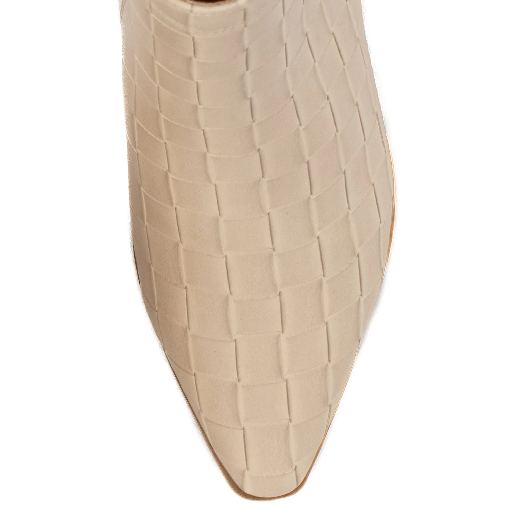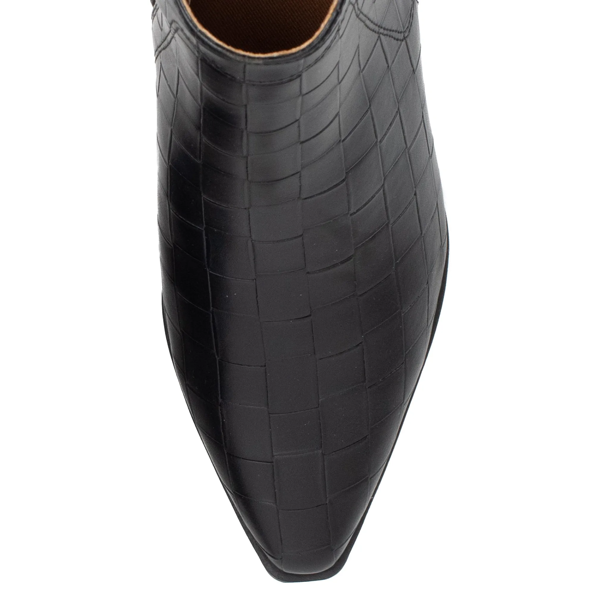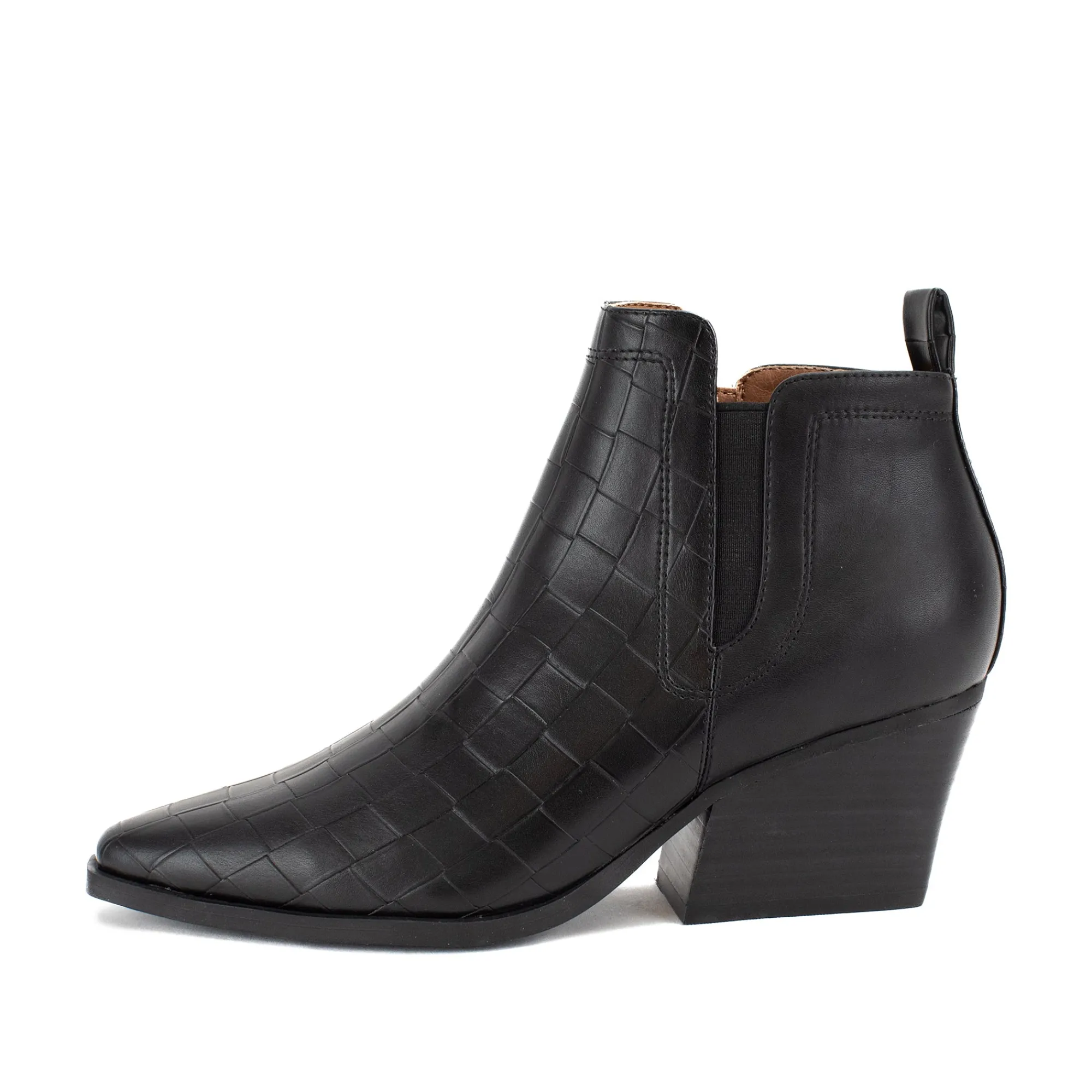 A Classic And Elegant Pointed Toe Bootie With A Woven Embossed Texture. Stand Comfortably In A Wide Block Heel With A Modern Square Shape.