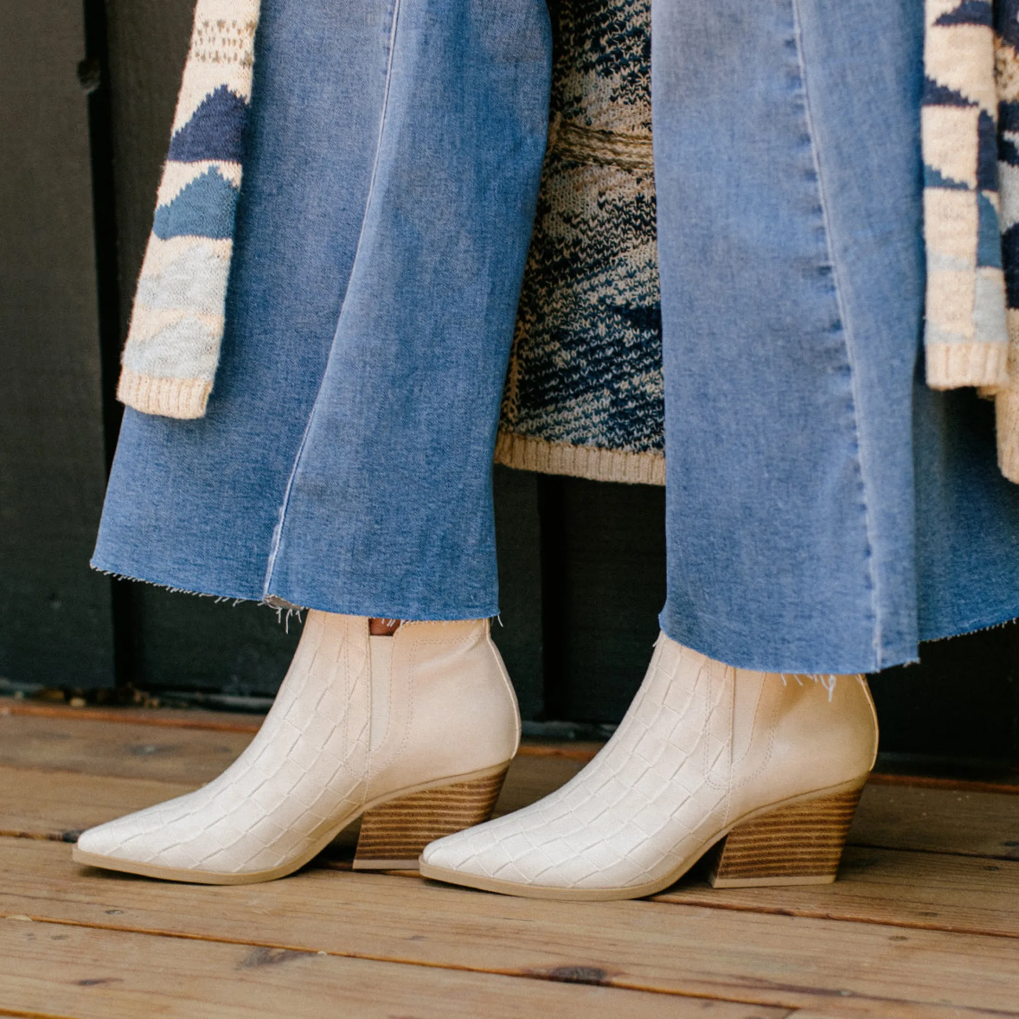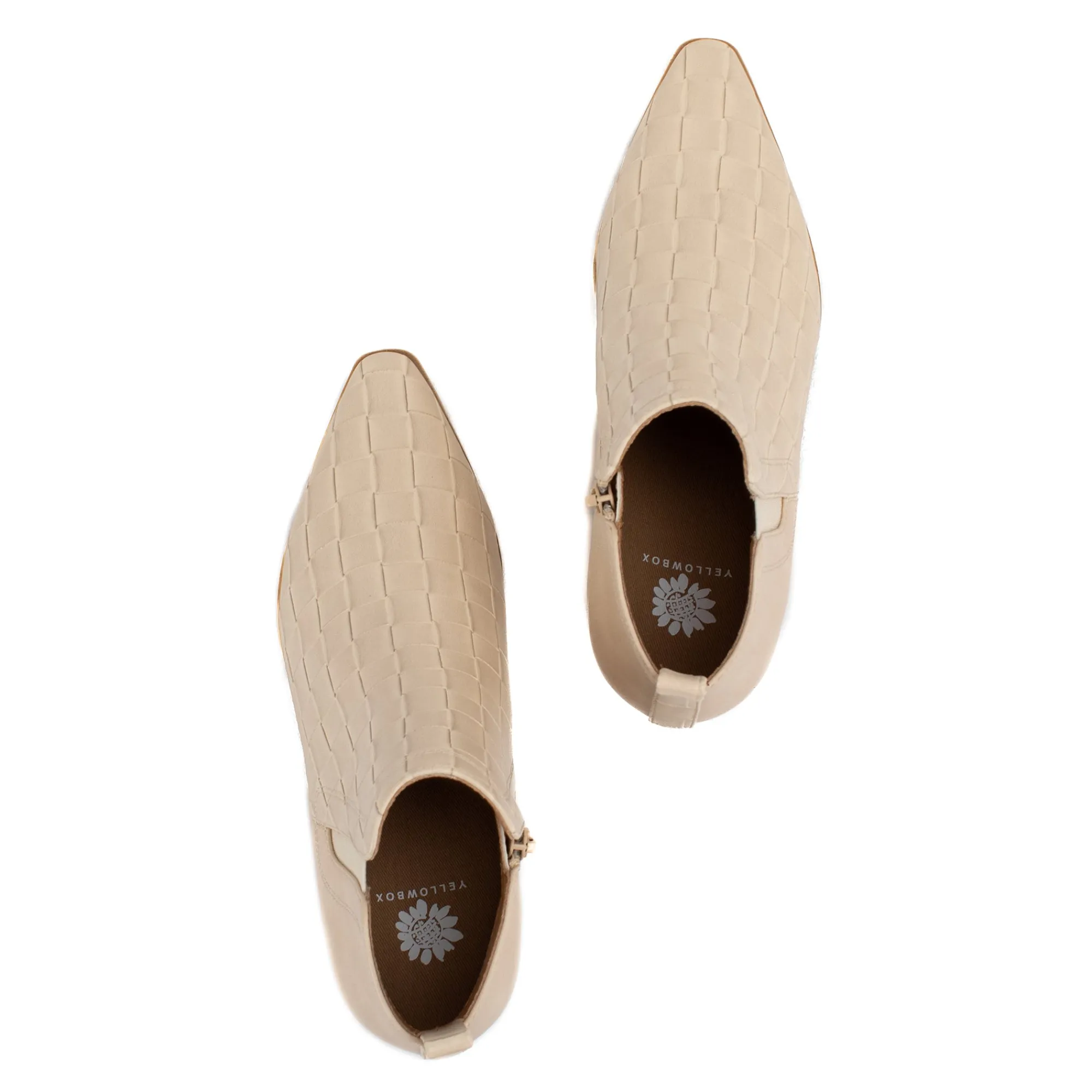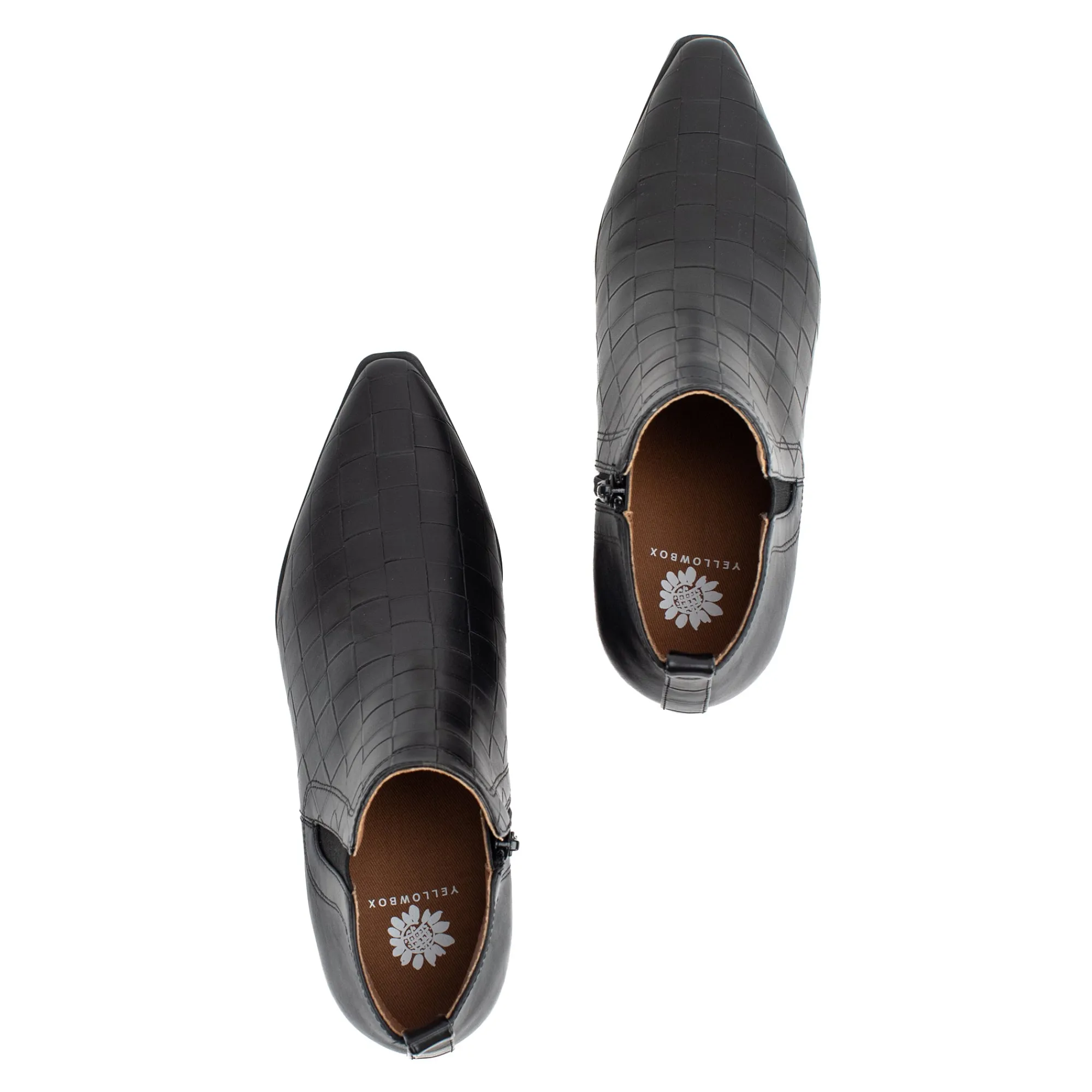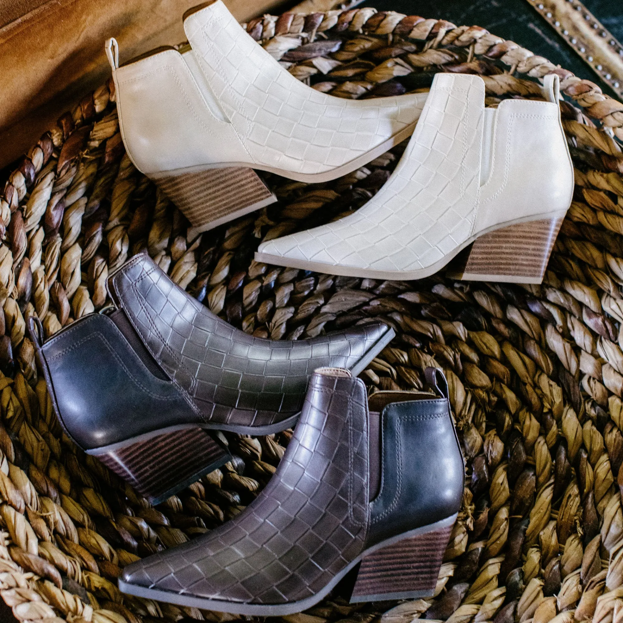 A Classic And Elegant Pointed Toe Bootie With A Woven Embossed Texture. Stand Comfortably In A Wide Block Heel With A Modern Square Shape.